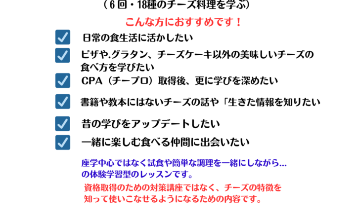 資格取得のための講座ではなくチーズの特徴を知って使いこなせるようになるための内容です。